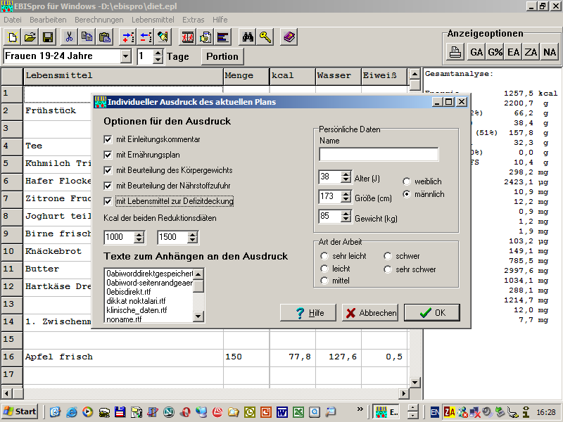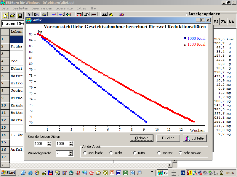 In der Gewichtsabnahmegrafik kann das gewünschte Gewicht, die Kcal der