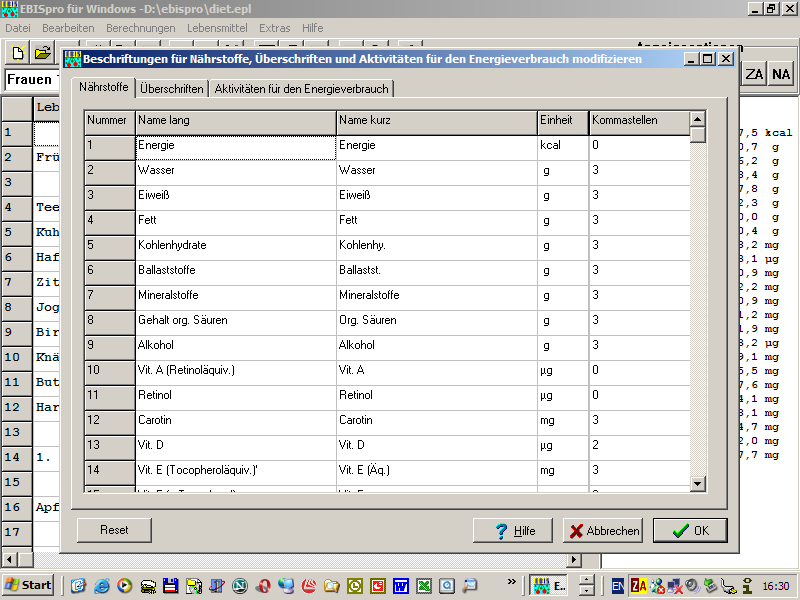 Es besteht jetzt die Möglichkeit die Beschriftungen im Programm (Nährstoffe,