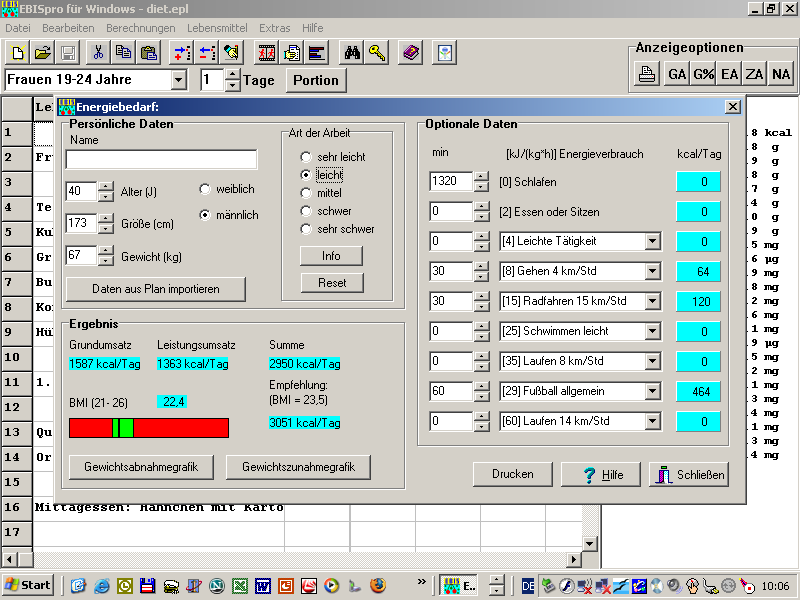 Bei der Energiebedarfsrechung werden die verbrauchten Kcal für jede