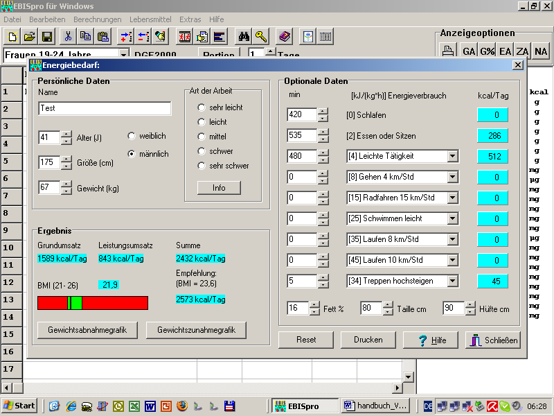 Sie können jetzt Angaben zum prozentualen Fettanteil und dem Taille/Hüftumfang machen die im Kommentar ausgewertet werden.