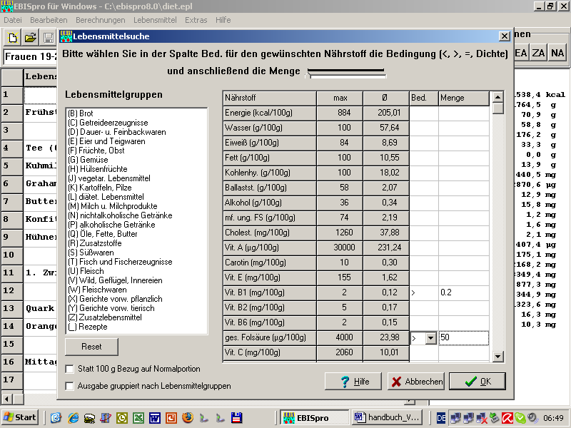 Bei der Lebensmittelsuche können Sie statt auf 100 g die Angaben auch auf die Normlportion beziehen und die Ausgabe nach den Lebensmittelgruppen sortieren.