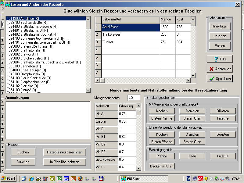 Bei den Rezepten können Sie mit Hilfe von vordefinierten Schemas Ausbeute und Verluste an Vitaminen und Mineralstoffen berücksichtigen.