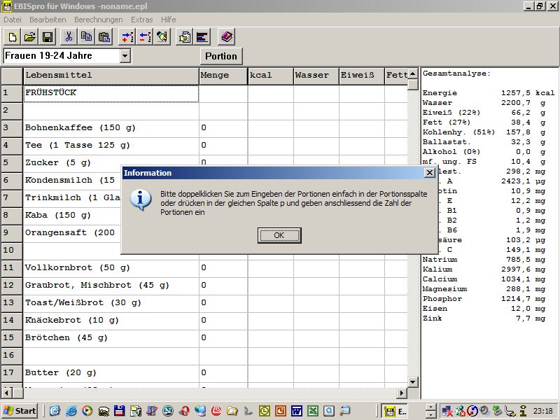 Um den Nährwert von Speisen berechnen zu können, ist die Eingabe